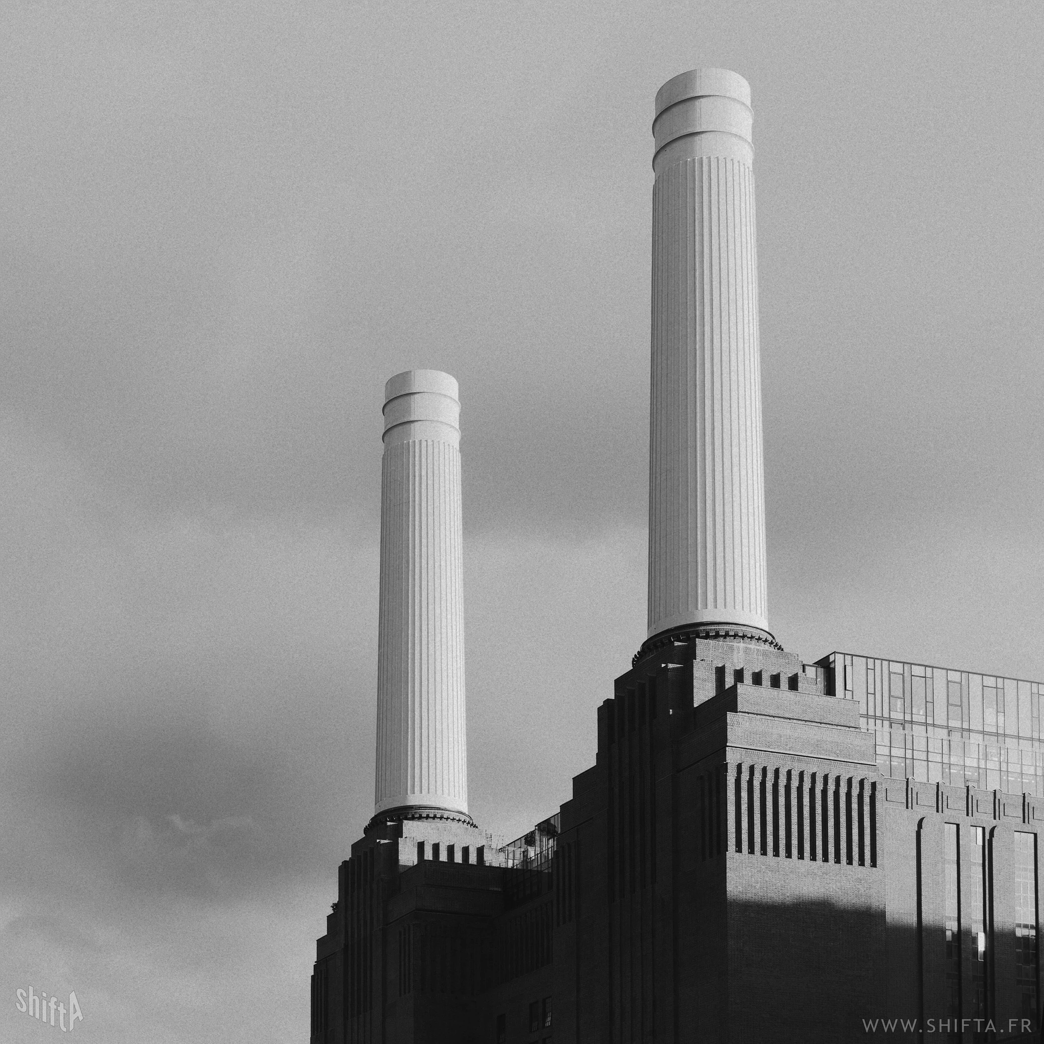 La Battersea Power Station (G. G. Scott, Londres, 1933) qui apparait sur l'album Animals (pochette à nouveau par Hipgnosis) :