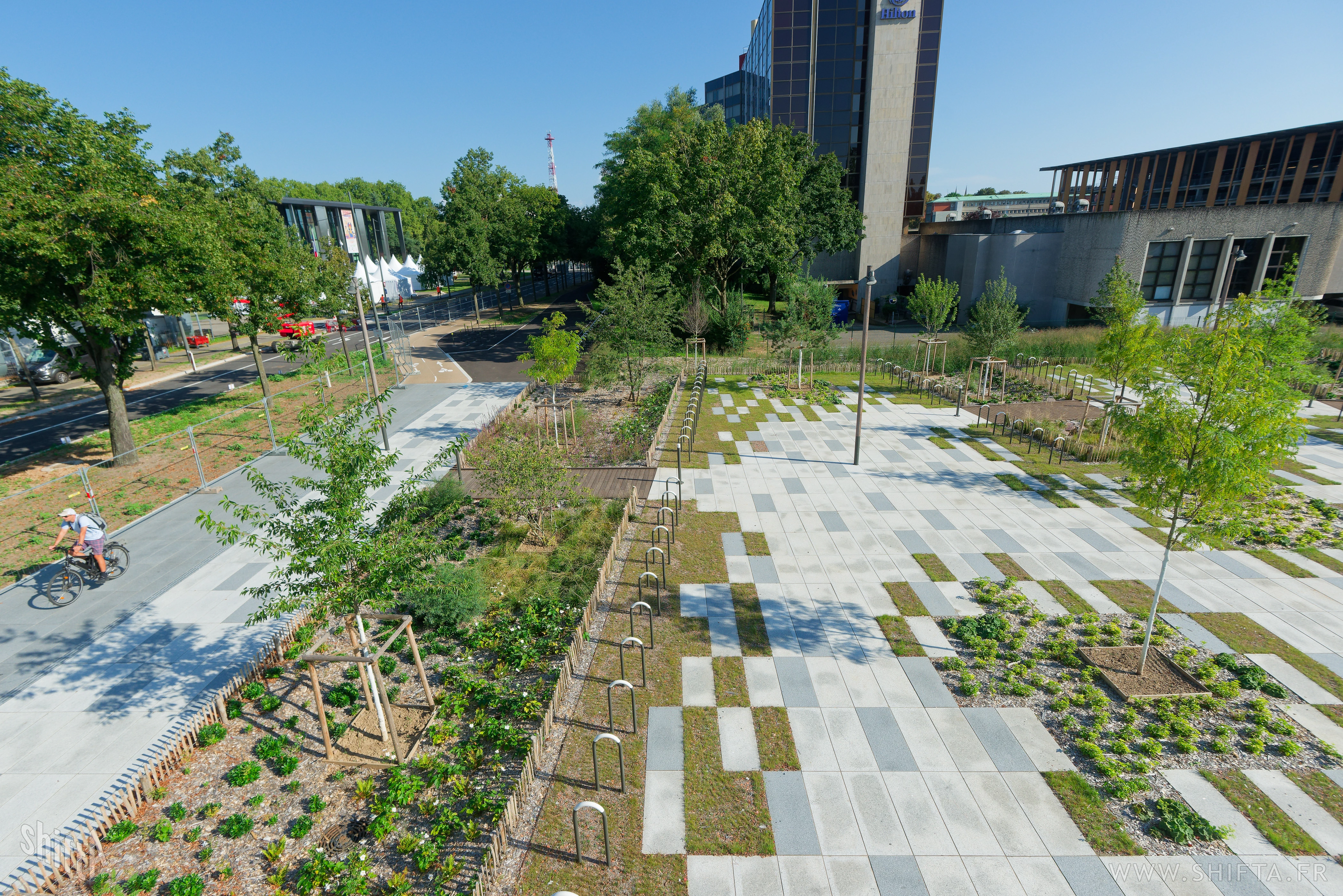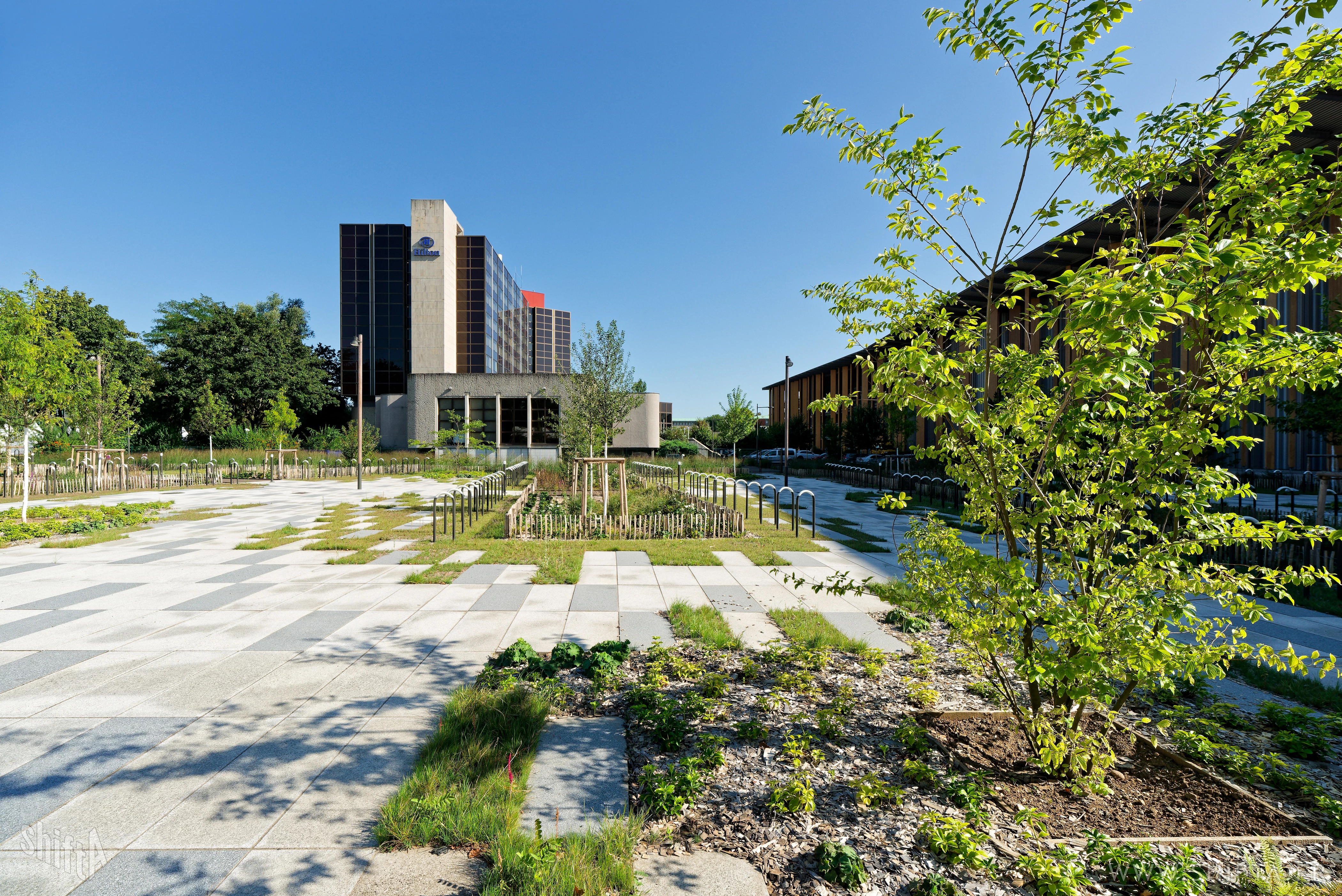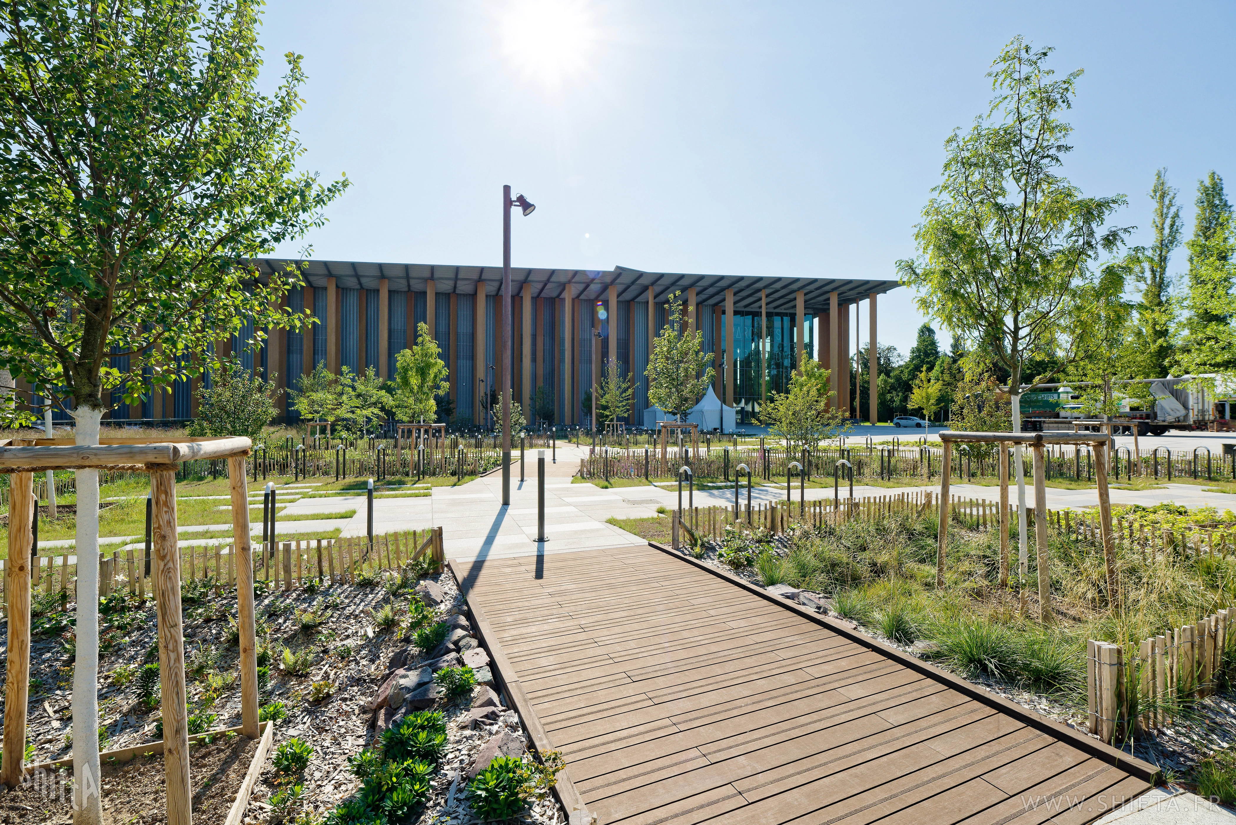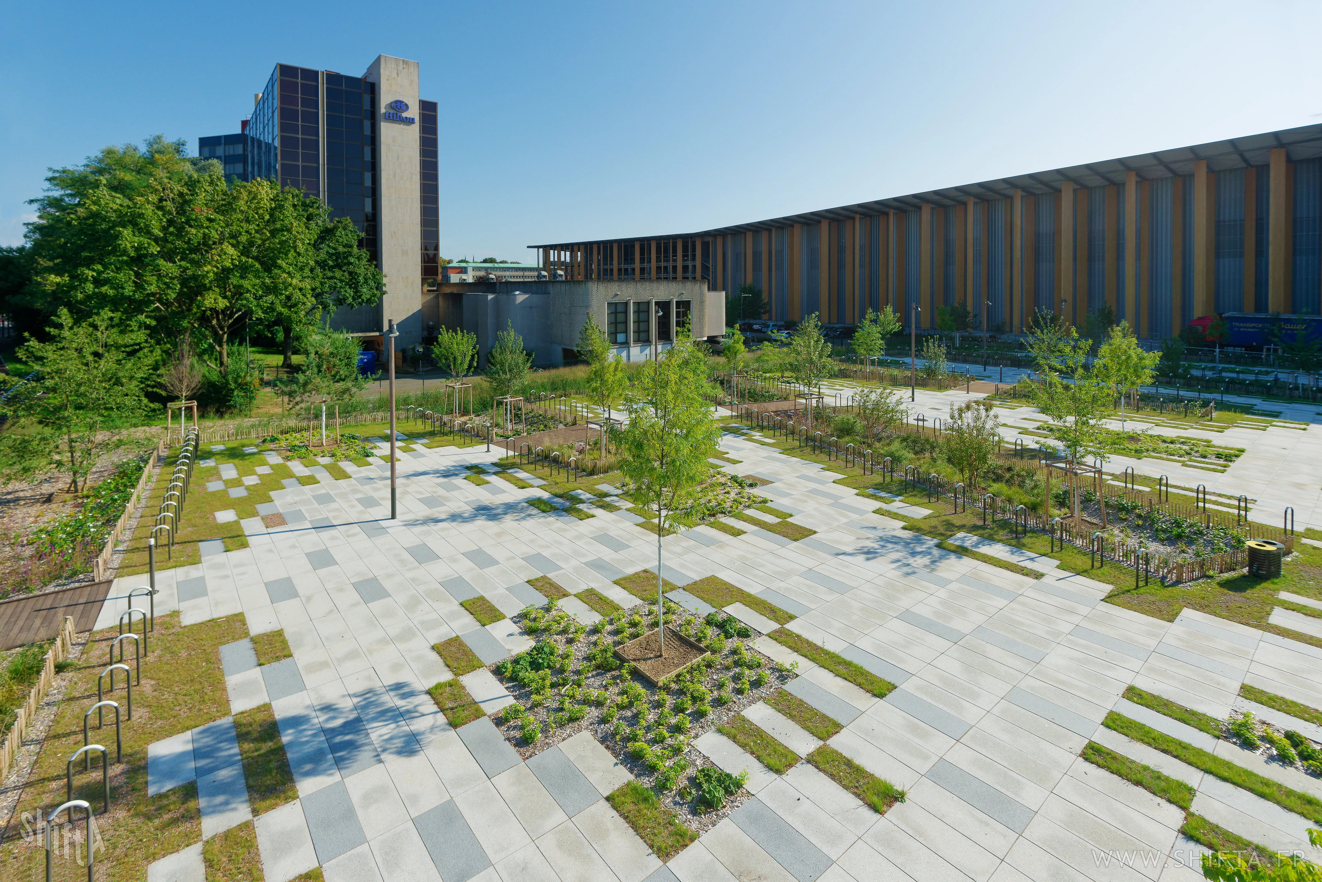 Premières photographies du tout nouveau parvis (par Land'Act et Lollier) du Palais des Expositions (PEX) de Strasbourg par Kengo Kuma & Associates.