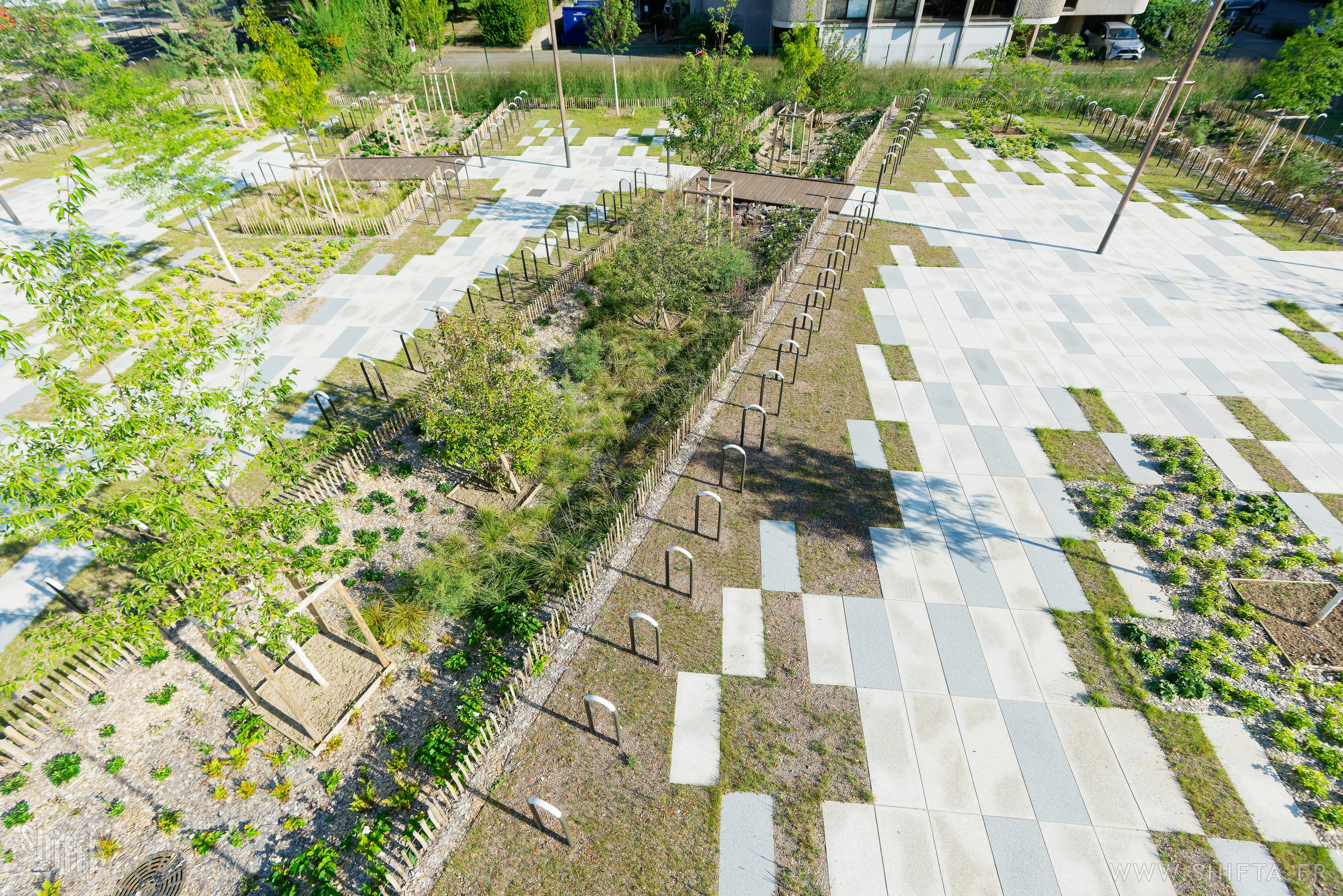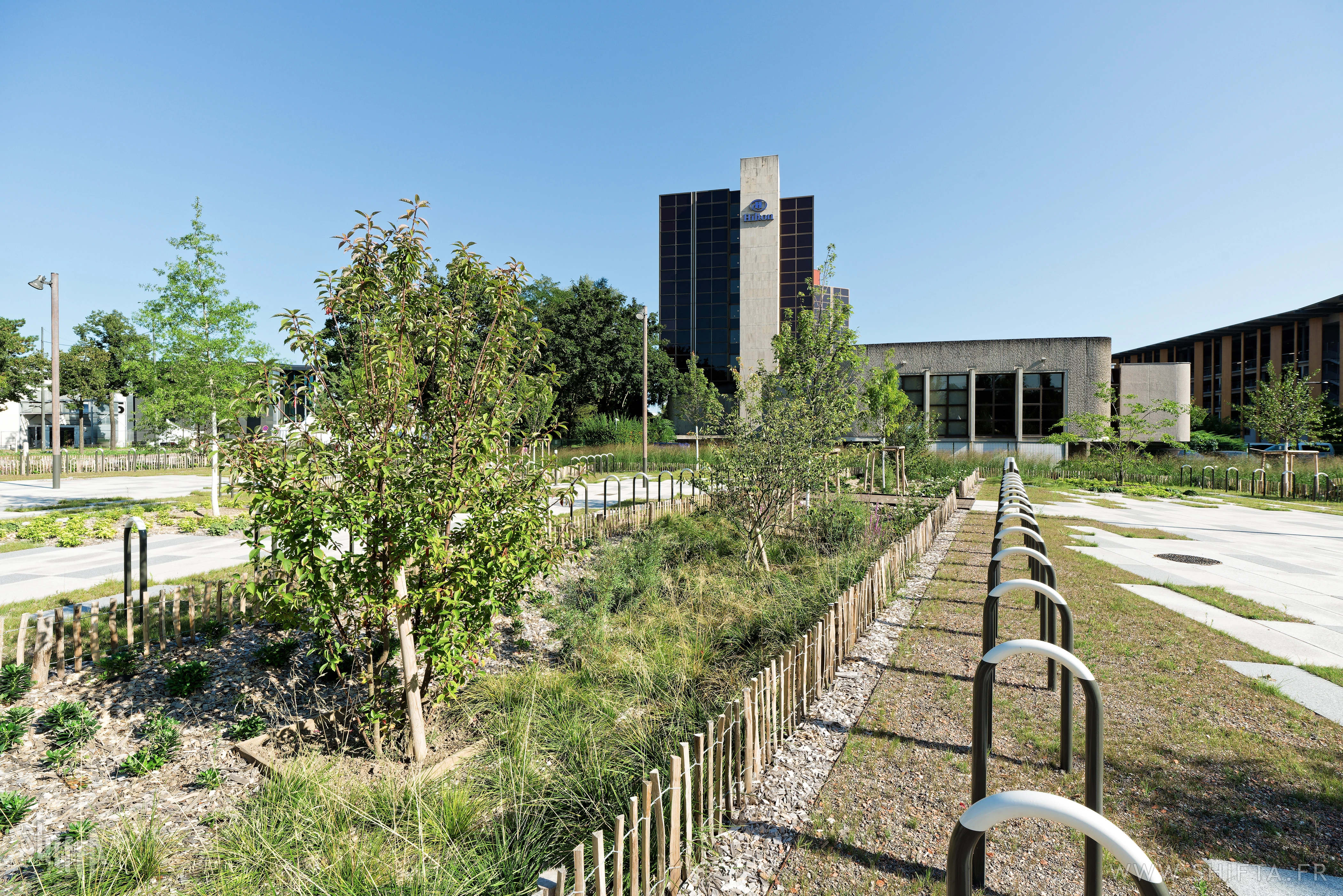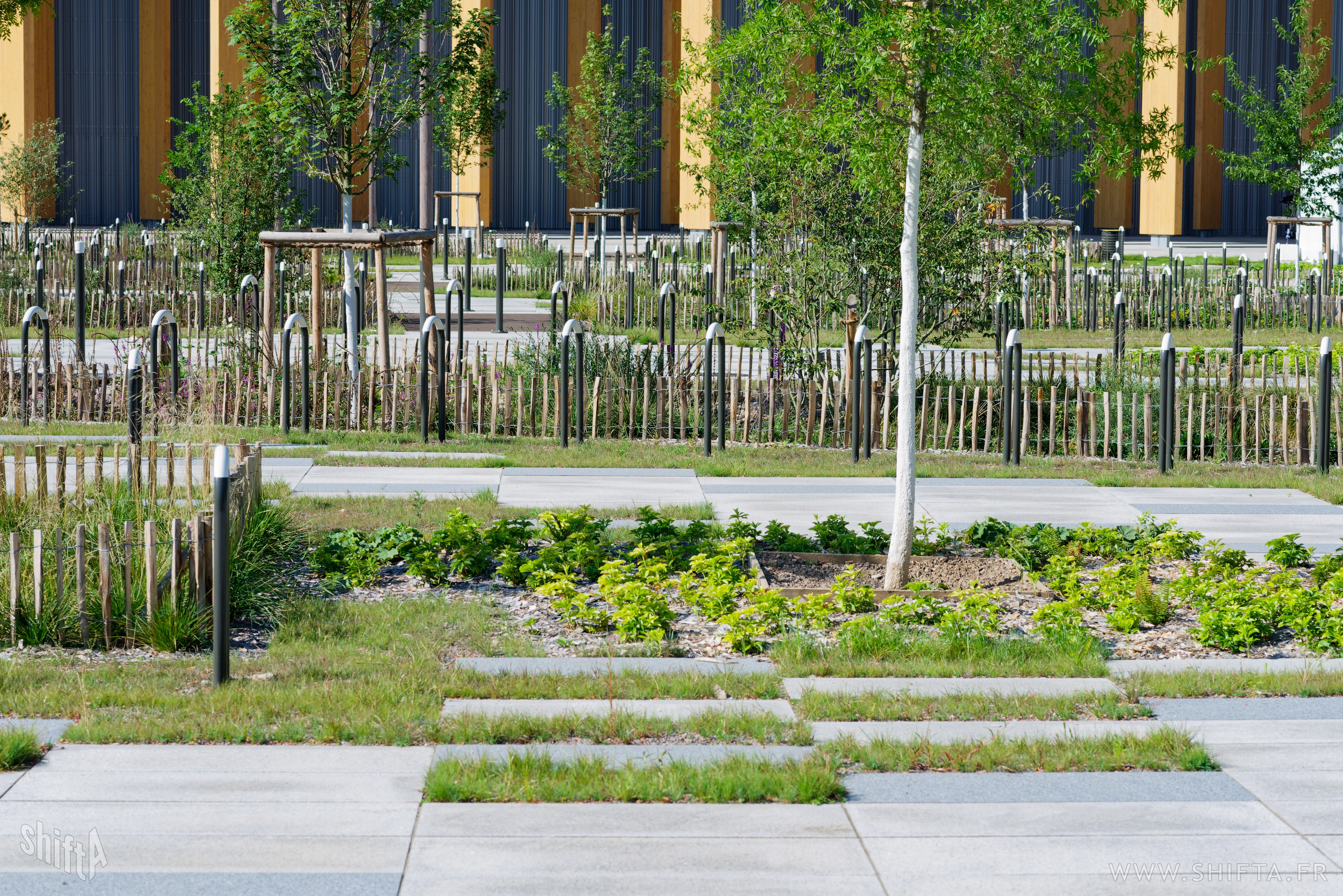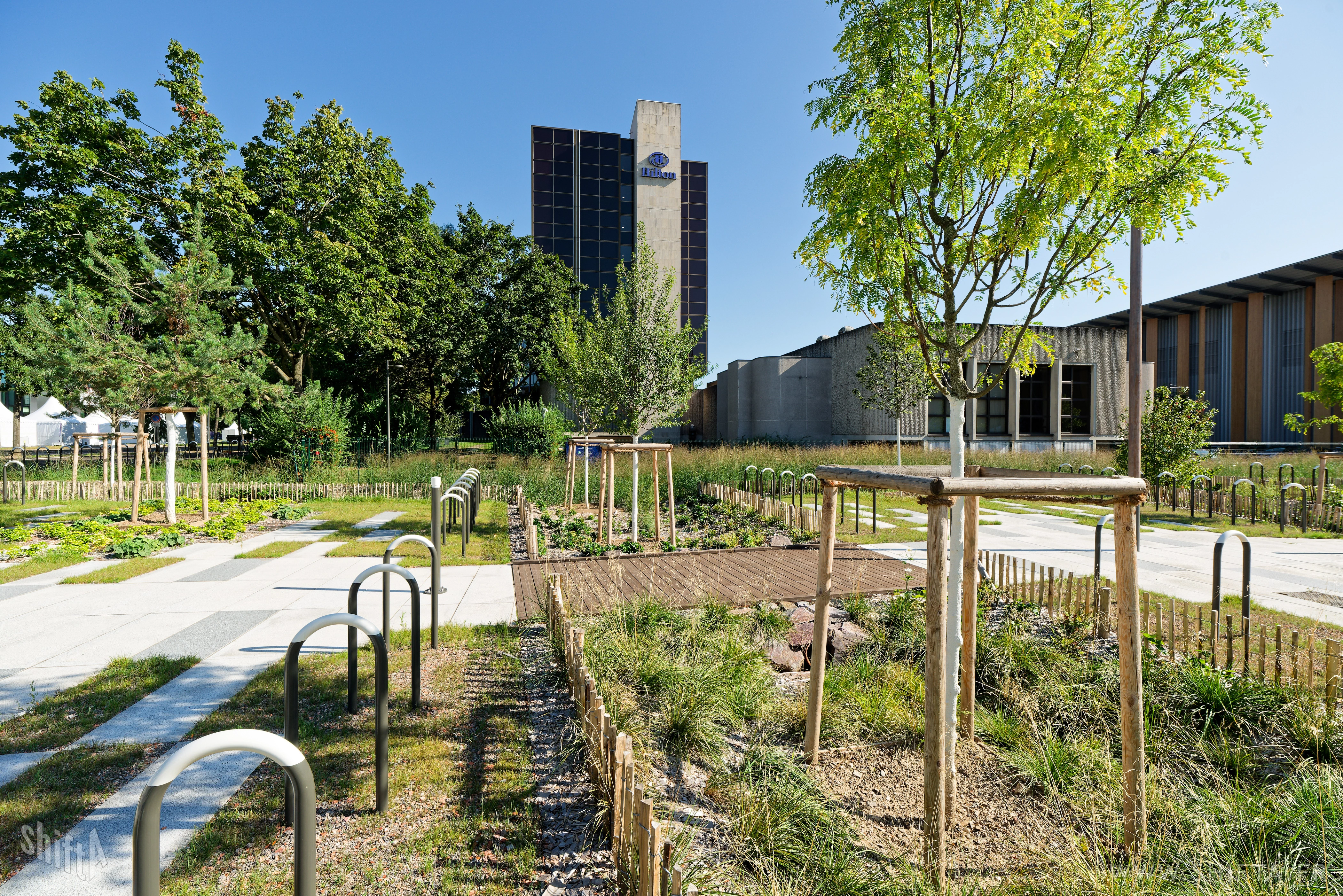 Premières photographies du tout nouveau parvis (par Land'Act et Lollier) du Palais des Expositions (PEX) de Strasbourg par Kengo Kuma & Associates.